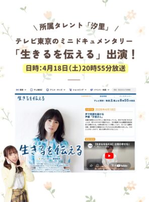 所属タレント「汐里」が、テレビ東京のミニドキュメンタリー番組「生きるを伝える」に出演いたします!